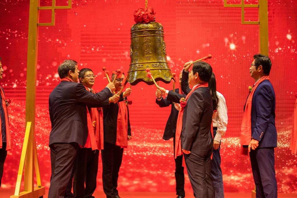 左广、何革伟、张春红、张英杰、王华 、郭忠诚、沈春晖等嘉宾共同敲响开市宝钟,祝愿昆工科技一路长虹、再创辉煌。