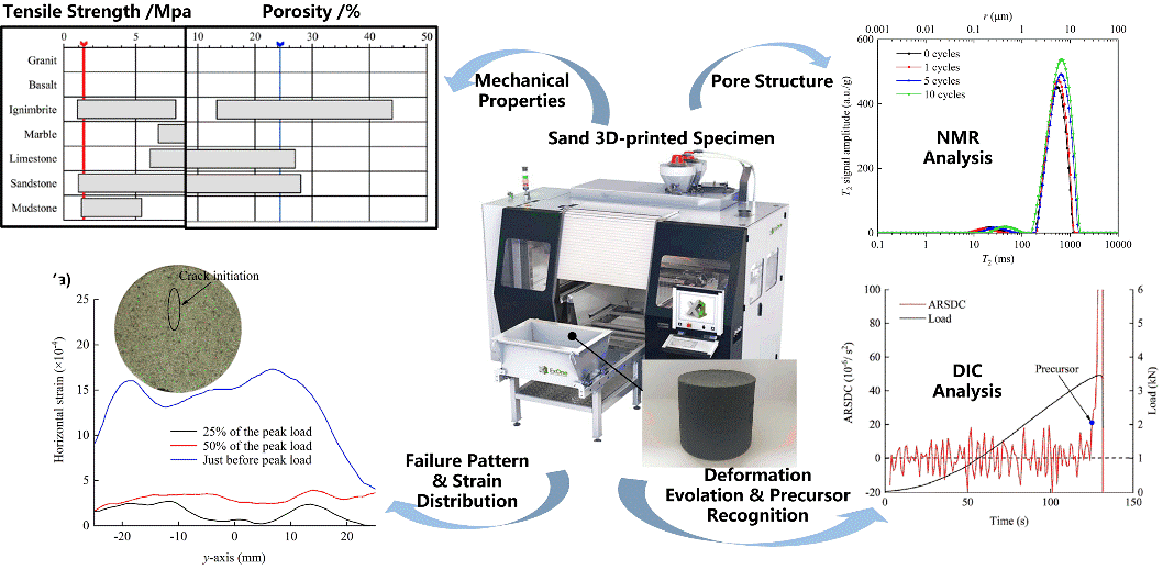 近年来,大量水电、矿山、交通、国防等工程在高寒地区修建。冻融循环是高寒地区广泛存在的自然现象,对这些岩石工程的建设有着不容轻视的影响。由于天然岩石的复杂性,无法获得一批具有相同结构和性质的岩样,也就意味着无法准确地评估冻融循环作用的影响效应,这是岩石力学领域富有挑战性的问题之一。为此,张科教授课题组充分利用3D打印技术在复杂结构高精度、可重复性制造中的突出优势,首次探究和验证了砂型3D打印材料模拟天然岩石,用于冻融岩石力学试验研究的可行性,结合核磁共振和数字图像相关技术,从孔隙结构、力学性能、破坏模式、应变分布和变形演化等多视角,系统地分析了冻融循环作用下砂型3D打印材料与天然岩石物理力学响应的相似性。此外,课题组提出的应变分异加速率指标为寒区地质灾害非接触式监测和预警提供了一种新的思路和方法,研究成果挖掘了3D打印和数字图像相关技术在寒区岩石力学和工程研究中的应用潜力。