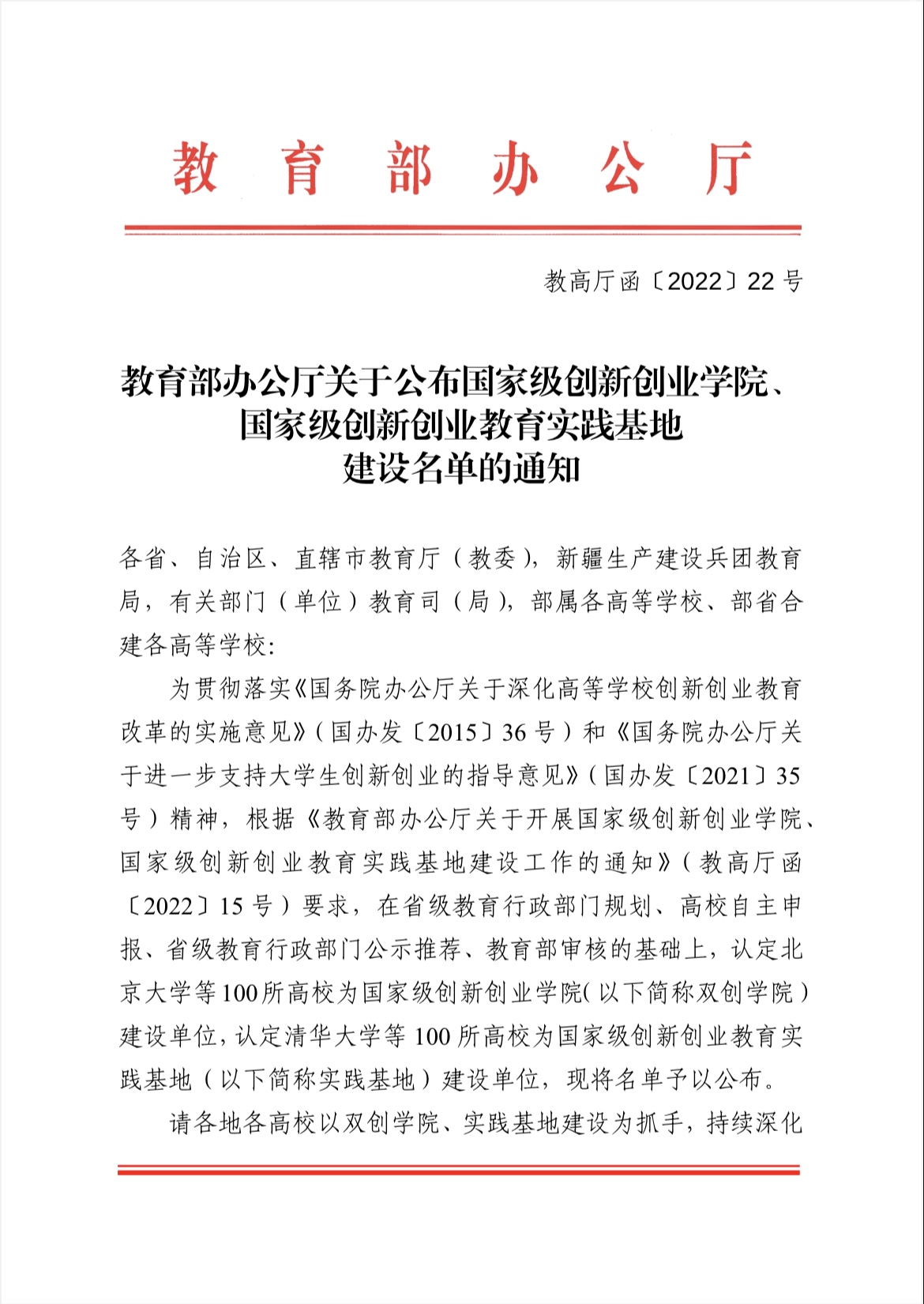 近日,教育部办公厅发布《教育部办公厅关于公布国家级创新创业学院、国家级创新创业教育实践基地建设名单的通知》(教高厅函〔2022〕22号),三亿体育_三亿(中国)一站式服务官方网站入选首批“国家级创新创业学院建设单位”,云南省共有2所高校入选国家级创新创业学院建设单位、2所高校认定为国家级创新创业教育实践基地建设单位。