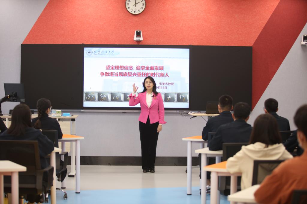 9月15日下午,校党委书记张英杰在多媒体中心405智慧教室,以线下+线上直播课的形式,为2022级8000余名本科新生上了一堂题为“坚定理想信念追求全面发展争做堪当民族复兴重任的时代新人”的形势与政策课。