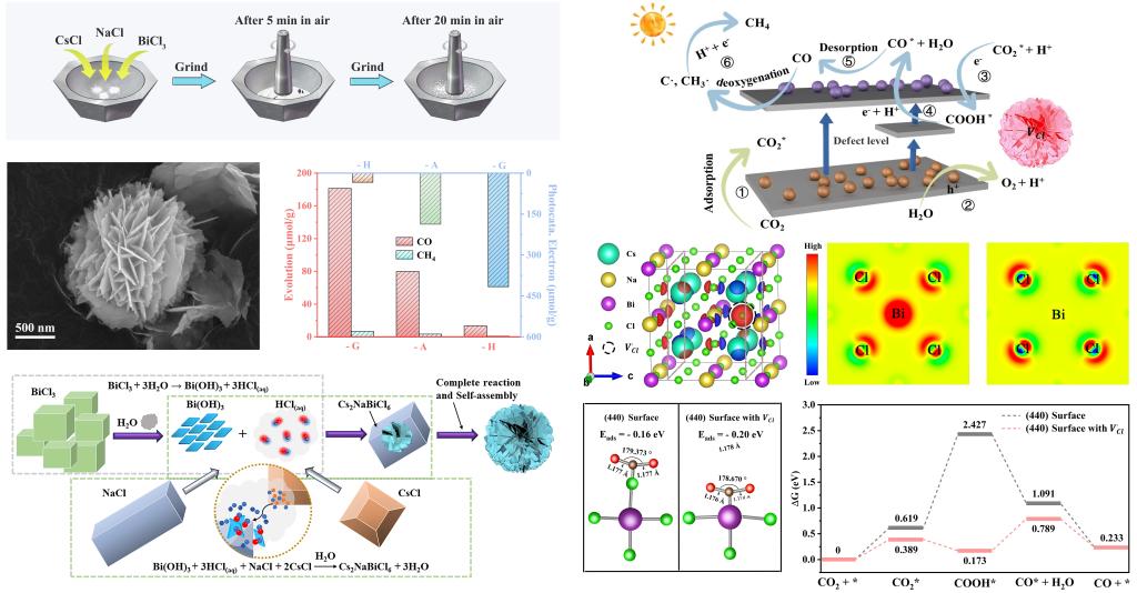 无铅卤化物双钙钛矿材料具有铅基钙钛矿的诸多优点,然而,由于光生电荷分离效率低且缺乏活性位点,它们通常表现出非常低的本征光催化CO2还原活性。在邱建备教授团队的相关研究中,通过简单的研磨法制备了结构与性能稳定、由高结晶纳米片组装的缺氯三维分级结构Cs2NaBiCl6多孔微球,实验结果和密度泛函理论计算表明,氯空位具有抑制光生电子-空穴复合、增强CO2吸附和显著降低关键中间体COOH*生成能垒的三重作用;在无牺牲剂的情况下,光催化还原CO2生成CO的产率首次在无铅卤化物钙钛矿光催化剂中达到30.22 µmol g-1h-1。本研究不仅提出了一种简单的方法合成富含氯空位的三维分级结构无铅卤化物钙钛矿,同时为显著提高光催化活性提供了一种新的设计理念。