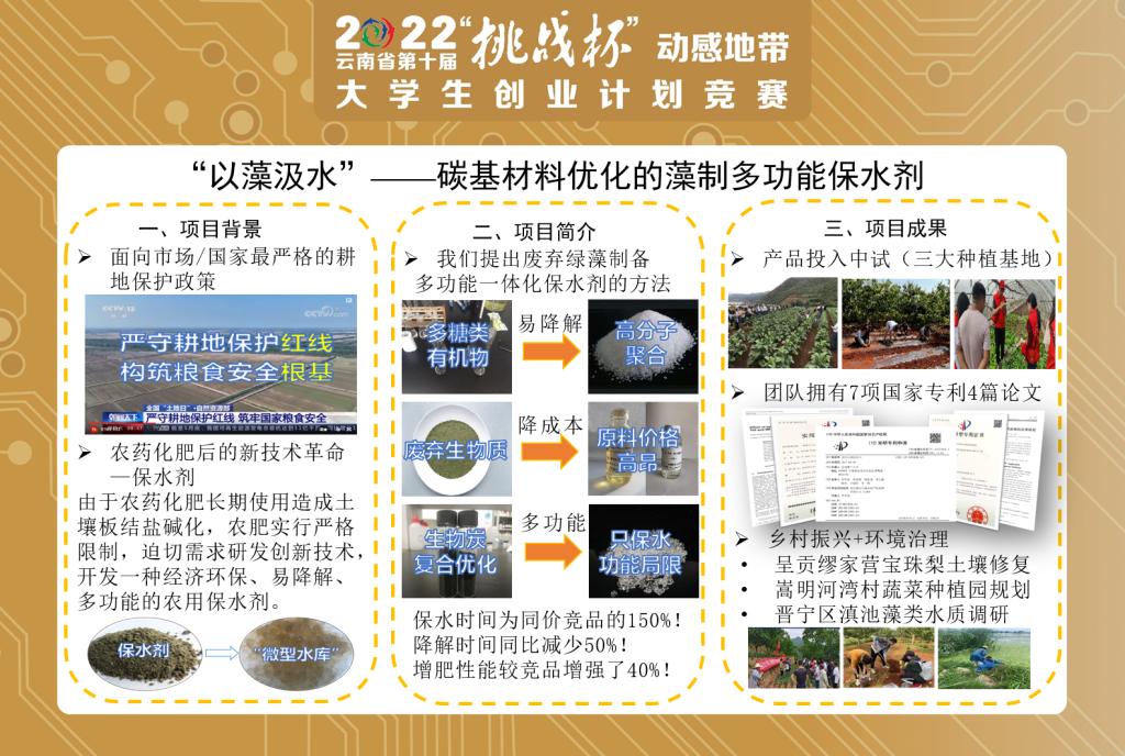 省级组委会成员、在昆各高校团委负责人、部分获奖团队代表、投资机构代表共计300余人参加颁奖仪式。三亿体育_三亿(中国)一站式服务官方网站团委负责人作为本届竞赛优秀组织奖代表发言,介绍三亿体育_三亿(中国)一站式服务官方网站创新创业工作经验,“以藻汲水”——碳基材料优化的藻制多功能保水剂团队受邀参加投融资创投会,并获省内多家投资机构的初步投资意向。