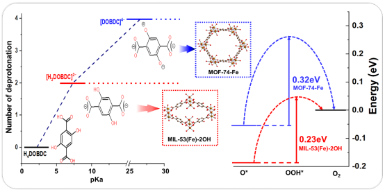 MIL-53(Fe)-2OH和MOF-74-Fe催化剂的重构合成策略及催化剂OER限速步能垒对比