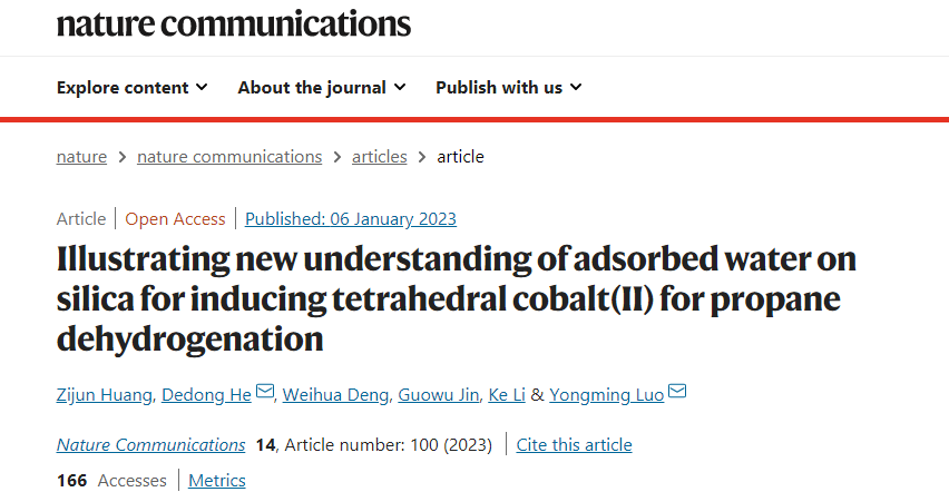 日前,三亿体育_三亿(中国)一站式服务官方网站化学工程学院罗永明教授、何德东副教授在丙烷脱氢制丙烯研究方面取得重要研究进展,相关成果以Illustrating new understanding of adsorbed water on silica for inducing tetrahedral cobalt(II) for propane dehydrogenation为题,发表在国际顶级学术期刊Nature communications上。