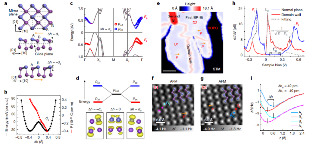 研究者发现单层黑磷结构单质Bi中可观测到的面内铁电性,其亚晶格之间有序的电荷转移和原子畸变是自发的。相比很多传统单质中的轨道均匀排布,研究者发现在单层的黑磷结构单质Bi中保持了较弱的各向异性sp杂化,导致结构上的中心对称破缺以及电荷重排,最终引发了面内的铁电性。此外,研究者还发现,由于电子结构和电极化的竞争,在180°尾对尾的畴壁结构中发现了反常的电势分布。