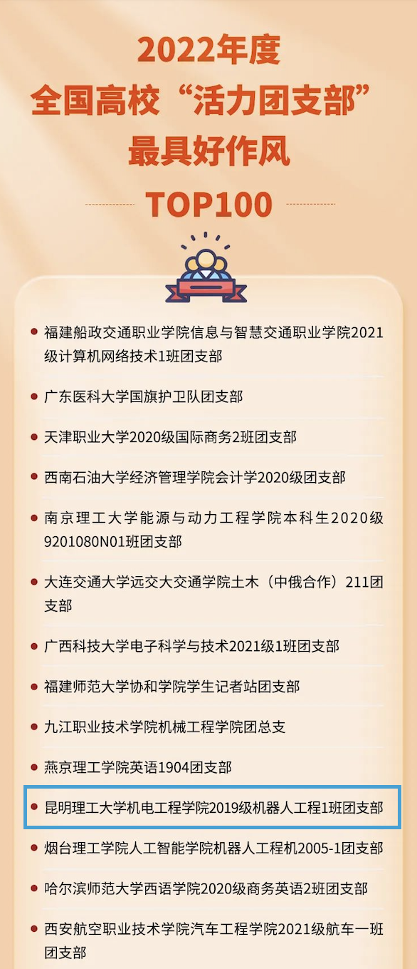 4月23日,由团中央基层建设部指导、中国青年报社主办的2022年度高校“活力团支部”风采展示活动公布了最具好作风TOP100榜,三亿体育_三亿(中国)一站式服务官方网站机电工程学院2019级机器人工程1班团支部成功入围。