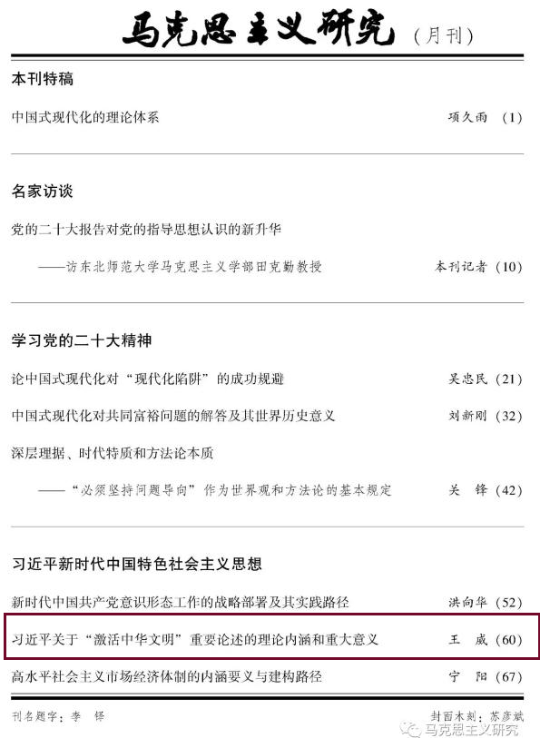 日前,马克思主义学院王威教授撰写的学术论文《习近平关于“激活中华文明”重要论述的理论内涵和重大意义》发表在《马克思主义研究》2023年第3期。