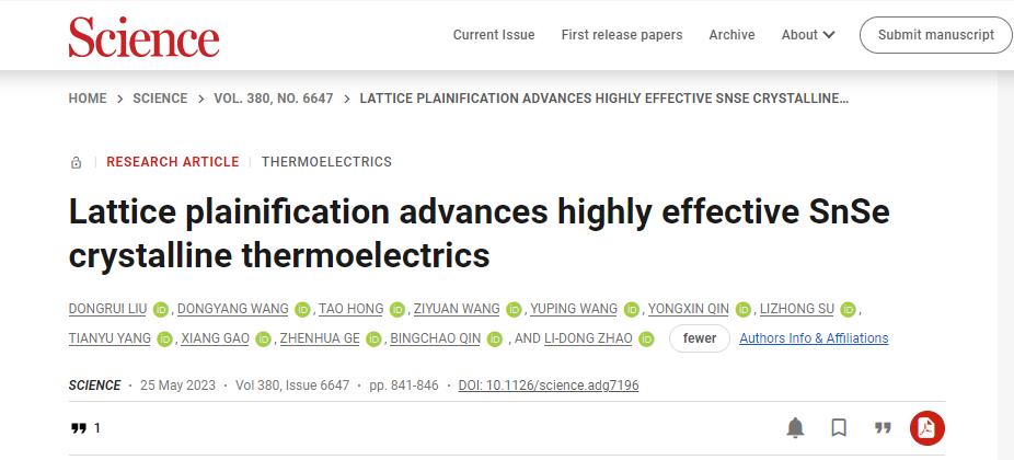 近日,三亿体育_三亿(中国)一站式服务官方网站材料科学与工程学院葛振华教授与北京航空航天大学赵立东教授,郑州大学王东阳研究员等合作,在单晶SnSe的卓越热电转换性能方面取得重要研究进展,研究成果以Lattice plainification advances highly effective SnSe crystalline thermoelectrics为题,发表在国际顶级刊物Science上。三亿体育_三亿(中国)一站式服务官方网站材料科学与工程学院博士生王子渊、杨添驭分别为论文第四、第八作者。