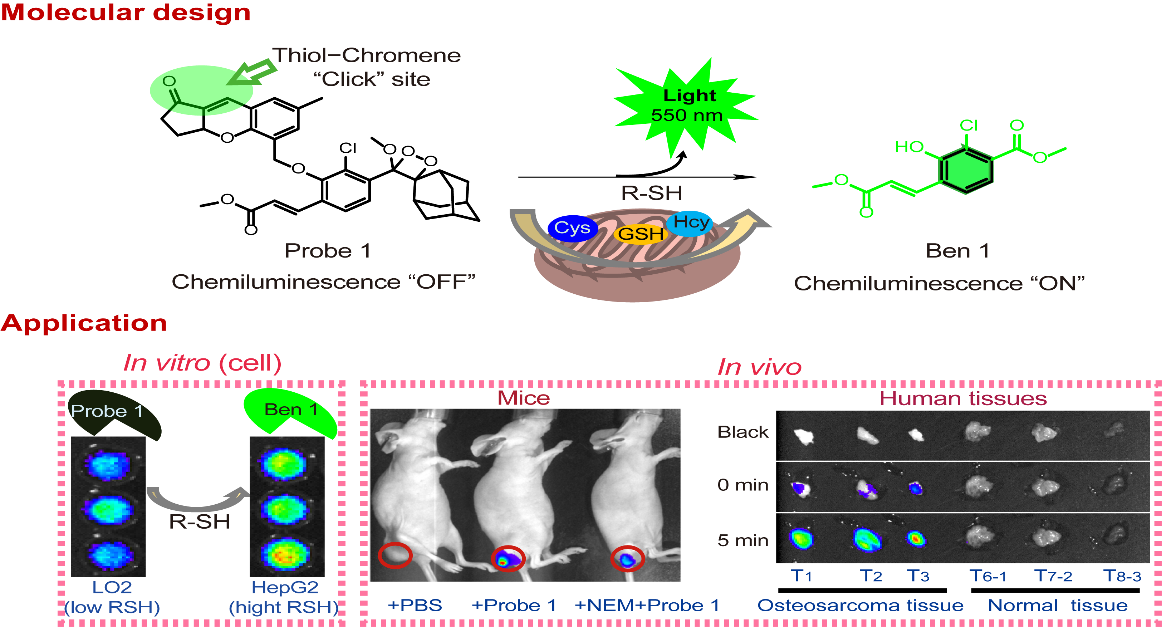 许敏教授研究团队以西南民族药/中药中广泛存在的天然色烯衍生物为母核合成了化学发光模式的硫醇检测探针,具有无需激发光,灵敏度高(检测限为0.13 μM),优于目前市售的荧光模式试剂盒:K558-100、MAK25的100倍以上,而且具有信噪比低、操作简单等优势。在体内外均可实现异常硫醇的高效检测和成像,有望开发为用于检测细胞裂解物、组织、血浆、血清、唾液或尿液中的游离巯基的试剂盒。