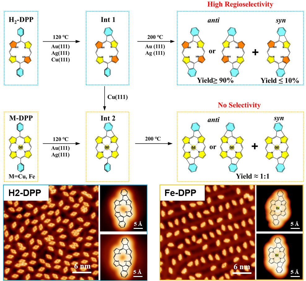 探索卟啉互变异构对其衍生物的区域选择性的影响对卟啉类药物的开发和应用具有重要意义。该项研究以二苯基卟啉为模型,通过实验与理论计算相结合的方式,研究了卟啉大环中心的二氢互变异构对外围两个苯基脱氢环化的影响。研究结果表明,不同的二氢互变异构体驱动外围苯基脱氢环化的能垒差异造成了最终产物的区域选择性,其中反式构型的产率可达90%以上。卟啉大环中心的两个氢原子被金属(Cu或Fe)取代后,苯基脱氢环化产物的选择性消失,进一步验证了二氢互变异构体驱动外围苯基脱氢环化的区域选择性。该项研究从原子尺度上揭示了卟啉衍生物脱氢环化区域选择性的机理,对理解有机大环分子的化学转化过程起到积极作用。