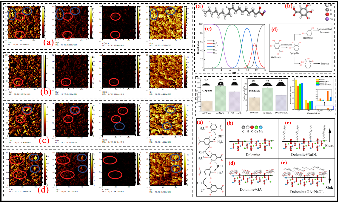 该研究以没食子酸为磷灰石正浮选中脉石矿物的新型绿色高效选择性抑制剂,通过微浮选试验与现代表面分析测试手段相结合的方法,研究了抑制剂没食子酸对磷灰石与白云石的选择性抑制行为,实现了磷矿的高效清洁浮选分离和富集,同时揭示了抑制剂对两种矿物的选择性抑制机理,没食子酸通过其结构中的羧基等极性官能团选择性地化学吸附在脉石矿物表面的活性位点,进而产生了选择性抑制效果,最终建立了抑制剂在矿物表面选择性吸附模型。