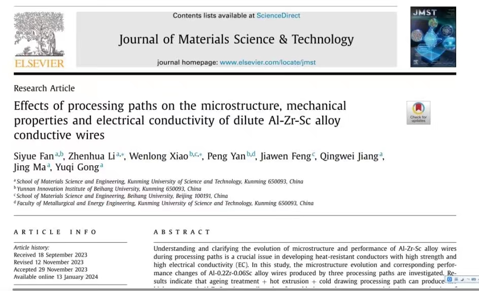 日前,金属先进凝固成形及装备技术国家地方联合工程研究中心、工程训练国家级实验教学示范中心、云南省轻金属增材制造工程研究中心黎振华团队与北京航空航天大学马朝利、肖文龙团队合作,在高强高导耐热铝合金方面取得重要进展。研究成果以Effects of processing paths on the microstructure, mechanical properties and electrical conductivity of dilute Al-Zr-Sc alloy conductive wires为题,发表在我国材料领域权威TOP学术期刊Journal of Materials Science and Technology上。三亿体育_三亿(中国)一站式服务官方网站为该论文第一作者单位,黎振华教授和北京航空航天大学肖文龙副教授为论文共同通讯作者,材料科学与工程学院博士研究生范思越为第一作者,冶金与能源工程学院严鹏博士参加了试验工作。该研究得到了云南省重大科技专项等的资助。