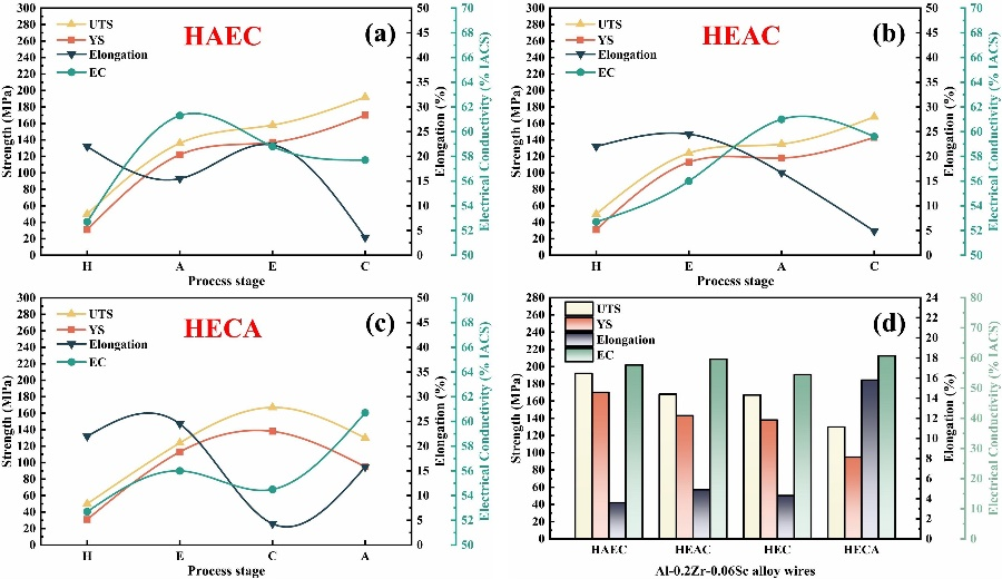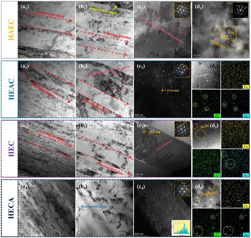 云南铝资源丰富,近年来绿色铝产业发展迅速。高强高导耐热铝合金是架空输电线路电缆用关键基础材料,具有万亿以上的市场规模。随着特高压、远距离、大容量输电和清洁能源利用的发展,对架空导线的导电率、强度、耐热性能等提出了更高要求。但提升材料导电率与提高强度和耐热性之间存在矛盾。Al-Zr-Sc合金强度、导电率和耐热性能突出,具有广阔的应用前景。阐明加工路径对Al-Zr-Sc合金微观组织和性能的影响对克服材料导电率与提高强度和耐热性之间的矛盾、提高合金性能至关重要。该研究系统考察了加工路径对Al-Zr-Sc合金微观组织与性能的影响,获得了各工艺环节对合金组织、强度和导电率影响的定量关系。结果表明,通过快速凝固-热变形-时效-冷拔路径,充分利用细晶强化、Al3(Zr,Sc)相析出强化和位错强化和热变形过程中Sc原子的动态析出,可获得强度、导电率及耐热性良好匹配的Al-Zr-Sc合金导线。