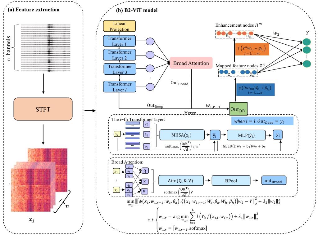 在脑机接口领域,针对癫痫发作期预警的世界性难题,运用癫痫病的神经科学机制和脑电信号数据,考虑大脑神经元同步放电的时空遥相关性,将深度学习和广度学习的结果进行增强并嵌入到高维空间进行二次学习,建立了新的广度注意力机制的宽视角Transformer模型,将癫痫病发作期预报精度提高了5个百分点,达到92.3%。该成果以“B2ViT Net: Broad Vision Transformer Netwok with Broad Attention for Seizure Prediction”为题,发表于脑机接口顶刊IEEE Transactions on Neural Systems and Rehabilitation Engineering。系统科学专业2022级博士生施水玲为论文的第一作者,刘文奇教授为论文的通讯作者,三亿体育_三亿(中国)一站式服务官方网站为唯一署名单位。