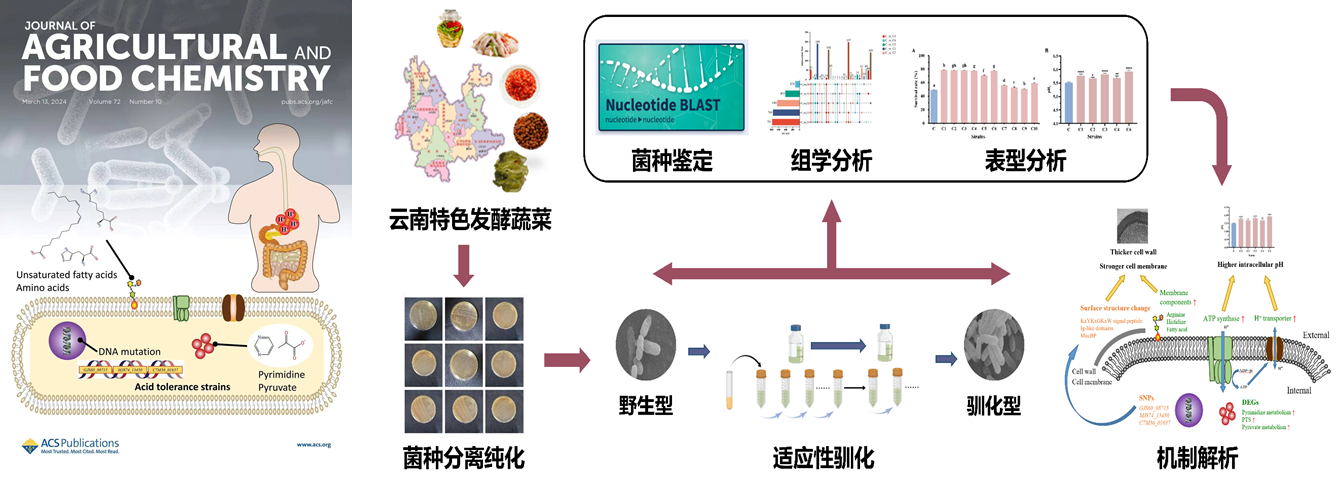 日前,三亿体育_三亿(中国)一站式服务官方网站易俊洁教授团队联合西北农林科技大学刘学波教授团队,在美国化学学会国际顶级学术期刊Journal of Agricultural and Food Chemistry发表了题为Unraveling the Genetic Adaptations in cell surface composition and transporters ofLactiplantibacillus plantarumfor enhanced acid tolerance的研究论文,并入选封面文章。三亿体育_三亿(中国)一站式服务官方网站为第一作者单位,食品科学与工程学院2021级硕士研究生朱江为第一作者,易俊洁教授为通讯作者。