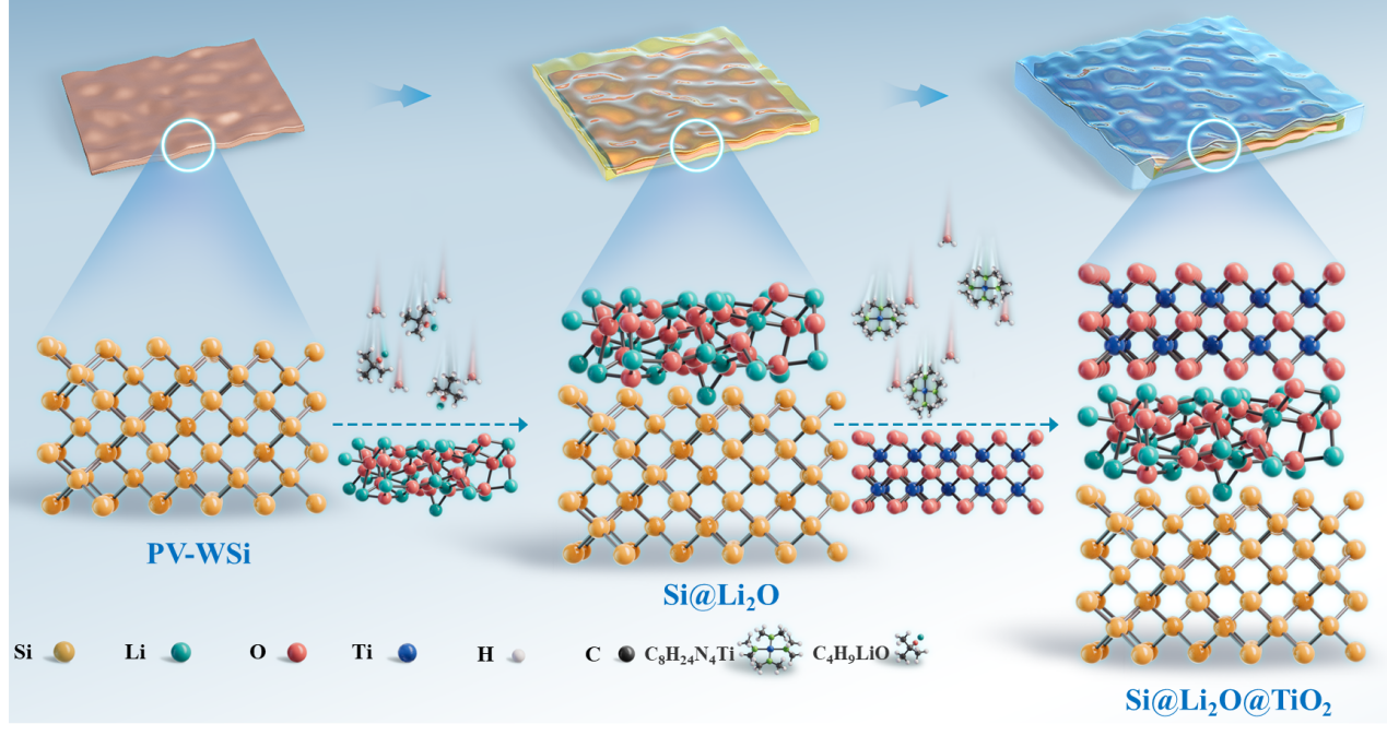 光伏产业是推动世界能源变革的重要引擎,双碳战略推动光伏产业蓬勃发展。硅片生产是光伏产业链的重要环节,在此过程会有大量的高纯硅料损失,形成切割硅废料(其粒度越来越细,产量逐年增长)。传统回收工作主要集中在高温重熔制备再生工业硅,难以实现高值利用。鉴于切割硅废料具备的独特禀赋(粒度细、片层结构等),团队骨干李绍元等人提出利用光伏硅废料的二维结构特性,结合流化床原子层沉积技术在硅废料表面连续、可控地沉积非晶Li2O和TiO2包覆层,以制备高倍率(20 A·g-1电流下放电比容量大于900 mAh·g-1)和高首效(90.9%)硅基负极材料,为光伏硅废料的增值利用提供新思路。