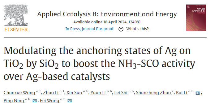 日前,环境科学与工程学院宁平、李凯、王飞团队在金属锚定机制以及氨气选择性催化氧化领域取得重要进展。该研究成果以“Modulating the anchoring states of Ag on TiO2 by SiO2 to boost the NH3-SCO activity over Ag-based catalysts”为题,发表在环境和能源领域的著名学术期刊Applied Catalysis B: Environment and Energy上。三亿体育_三亿(中国)一站式服务官方网站为该论文第一作者单位,环境科学与工程学院李凯教授、宁平教授和王飞副教授为论文的共同通讯作者,博士研究生王春雪和李钊为共同第一作者。该研究得到了国家自然科学基金和云南省基础研究计划等项目的资助。