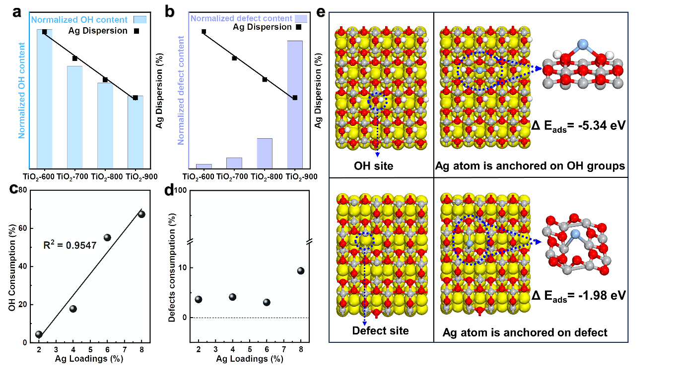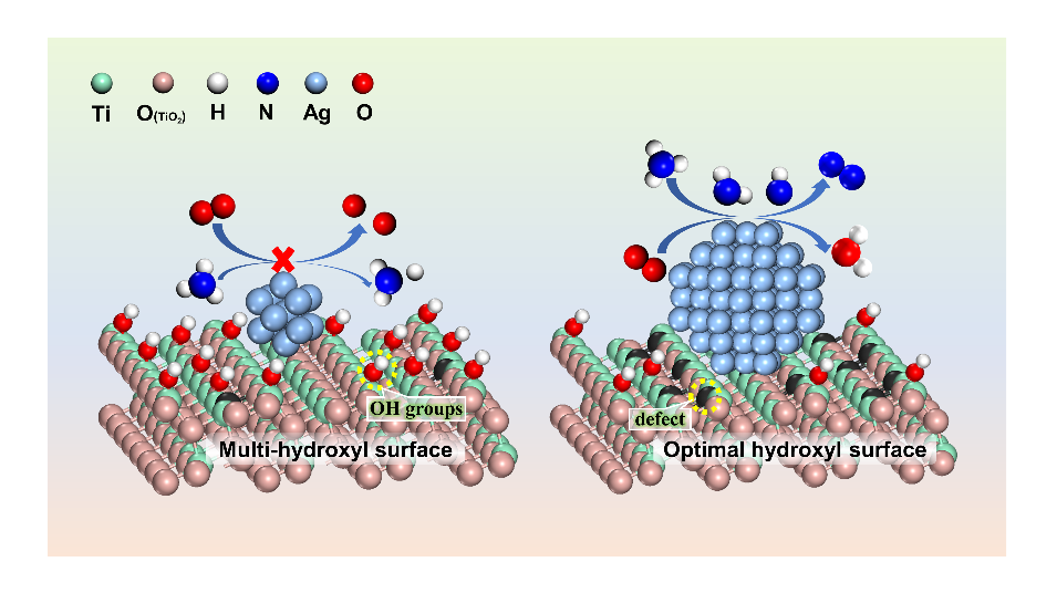 在 "双碳 "目标的背景下,零碳燃料(如 NH3/H2 或 H2)正在能源领域兴起,NH3 的不完全燃烧和逃逸使NH3减排和高效去除再次引起了研究人员的广泛关注。近年来,Ag基催化剂因其优异的低温活性和低成本被广泛作为NH3-SCO催化剂用于NH3的高效去除。由于Ag物种的尺寸和价态是影响其催化性能的关键因素,这取决于Ag在载体上的锚定位点及其含量。TiO2因其价廉易得、无毒无害、种类繁多等优点,已被广泛用作负载型催化剂的载体。对于不可还原性载体已有研究证明了表面羟基是金属原子的锚定位点,然而对于金属原子在不可还原性载体TiO2上的锚定位点仍然存在争议。探究Ag在TiO2上的直接锚定位点对于合理设计和优化用于高效净化氨气的Ag/TiO2催化剂至关重要。