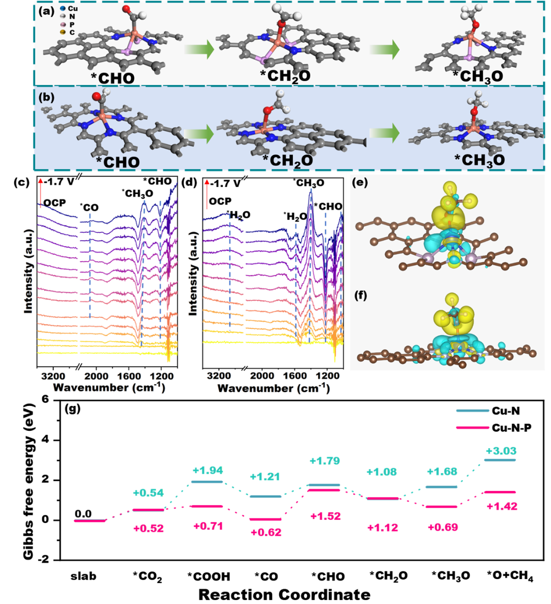 ECO2RR合成甲烷的关键是*CO、和*CHxO(x=1,2,3,4)等中间体与催化活性位点的吸附能的大小。一系列表征和DFT计算揭示了Cu作为催化的活性中心,P作为主要电子供体位点,改变了催化剂的表面的电荷分布,调节了反应中间体的吸附。从而在实验中明显观测到甲烷作为产物的选择性增加。该研究成果为CO2还原反应铜基催化剂的新合成方法开发以及铜原子配位环境的调控提供了新的思路。