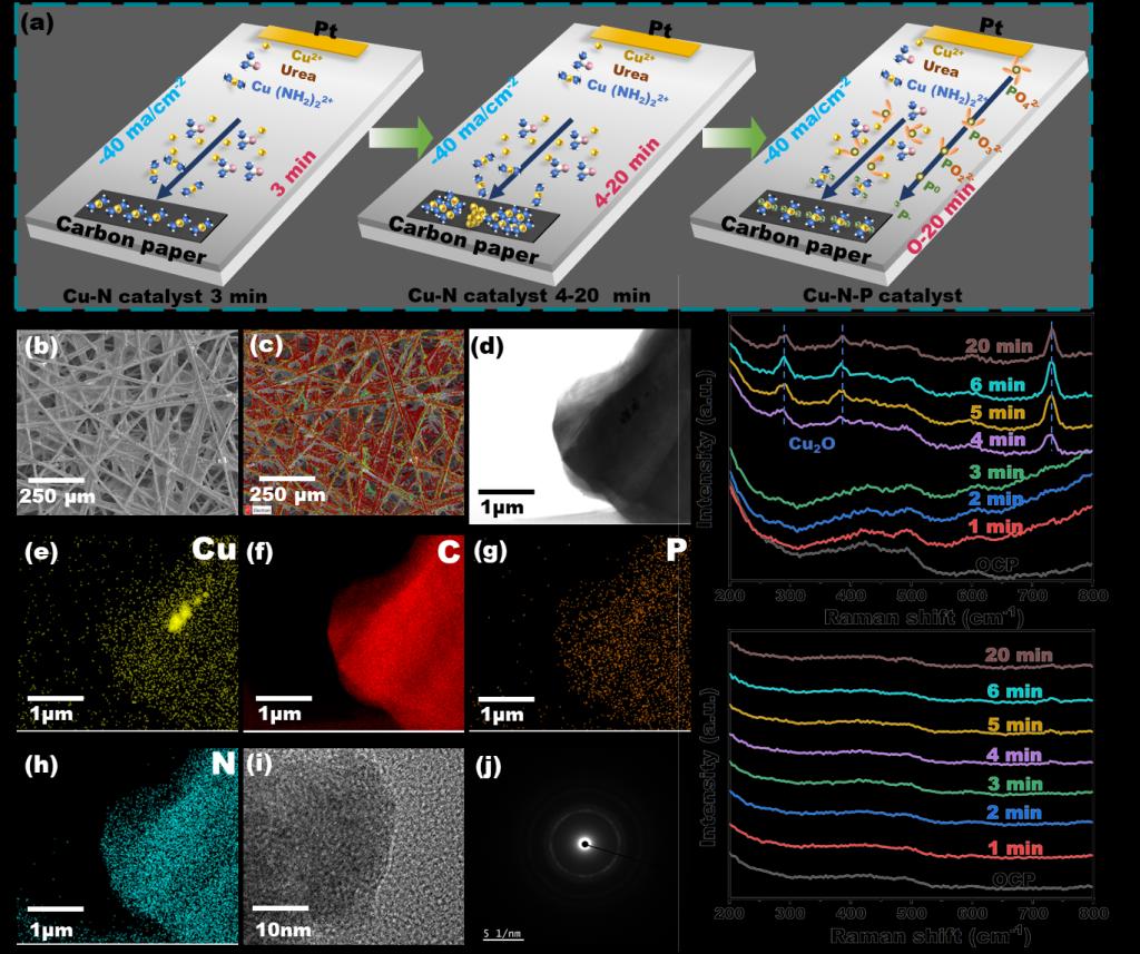 通过XRD、XPS和同步辐射等表征手段,对催化剂中Cu的配位情况进行了深入解析,在催化剂中检测到了Cu-N及Cu-P键,证明了N和P的成功掺杂,并通过在R空间的拟合结果确定了催化剂的配位结构。拟合结果也可以发现,通过P的掺杂电极表面的活性物种发生明显变化,这与电沉积过程的原位拉曼表征结果一致。
