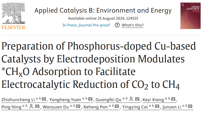 近日,宁平、瞿广飞教授团队在单原子催化应用于CO2资源化领域取得重要进展。相关研究成果以Preparation of Phosphorus-doped Cu-based Catalysts by Electrodeposition Modulates *CHxO Adsorption to Facilitate Electrocatalytic Reduction of CO2to CH4为题,发表于环境与能源领域顶级学术期刊Applied Catalysis B: Environment and Energy。