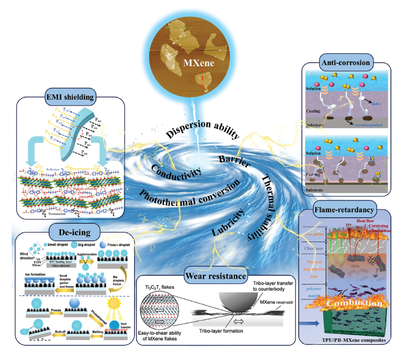 文章系统总结了MXene纳米片的多种制备方法及其优异性能和改性策略,结合MXene的阻隔性、润滑性、热稳定性、导电性和光热转换性,详尽讨论了MXene基聚合物涂层在防腐、摩擦、阻燃、电磁屏蔽和除冰等领域的应用,最后结合当前研究现状和新兴需求,针对性地探讨了MXene基聚合物涂层所面临的发展挑战及未来的研究机遇。