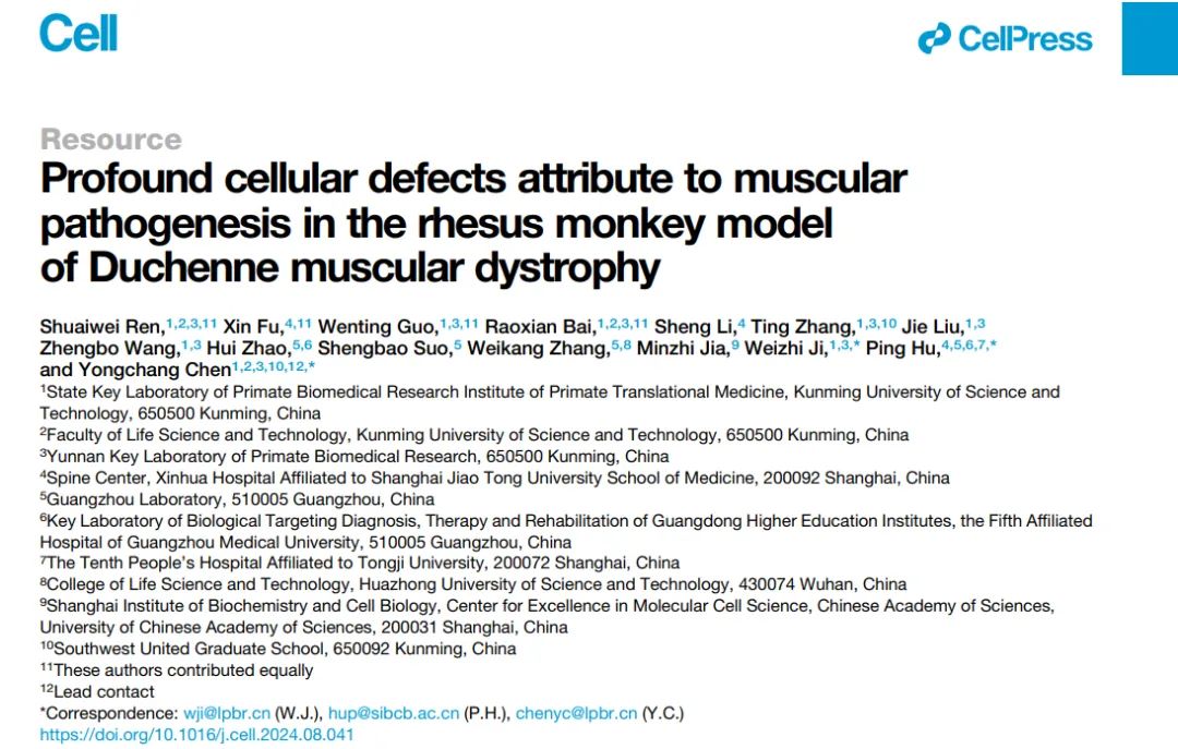 2024年9月20日,三亿体育_三亿(中国)一站式服务官方网站灵长类转化医学研究院、省部共建非人灵长类国家重点实验室、三亿体育_三亿(中国)一站式服务官方网站生命科学与技术学院陈永昌、季维智团队,与广州实验室、上海交通大学医学院附属新华医院等机构合作,应用非人灵长类疾病模型解析杜氏肌营养不良症(Duchenne muscular dystrophy,DMD)发病早期骨骼肌病理变化的关键机制,在Cell上发表题为Profound cellular defects attribute to muscular pathogenesis in rhesus monkey model of Duchenne muscular dystrophy的研究论文。三亿体育_三亿(中国)一站式服务官方网站陈永昌教授、季维智院士和广州实验室胡苹研究员为论文的共同通讯作者。三亿体育_三亿(中国)一站式服务官方网站灵长类转化医学研究院博士生任帅伟、白绕仙、博士后郭文婷,上海交通大学医学院附属新华医院脊柱中心傅鑫副研究员为论文的共同第一作者。