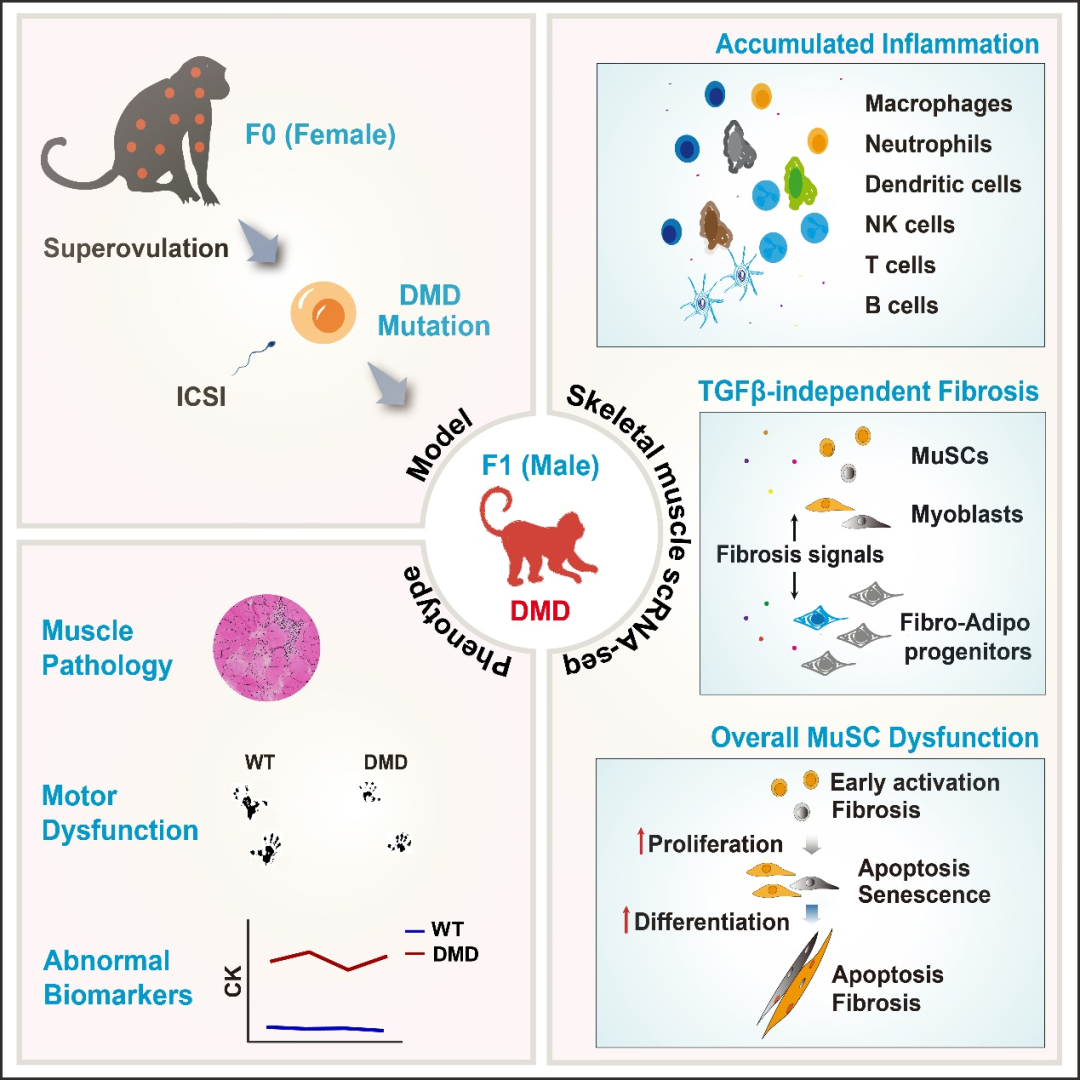 研究结果为DMD发病机制,特别是疾病早期的分子和细胞变化提供了新的见解。揭示了免疫、纤维化以及肌肉干细胞在DMD早期的动态变化,为早期干预和靶向治疗提供了科学依据。免疫细胞的急剧增加使肌细胞的生存环境恶化,提示抑制炎症反应在DMD治疗中至关重要。此外,DMD猴模型显示FAPs纤维化不依赖于TGFβ通路,为新药研发提供了新的方向;更重要的是,肌肉干细胞功能缺陷导致了肌肉修复障碍,提示DMD是一种干细胞疾病,开发细胞治疗或针对肌肉干细胞进行干预治疗也许是未来研究的重要方向。