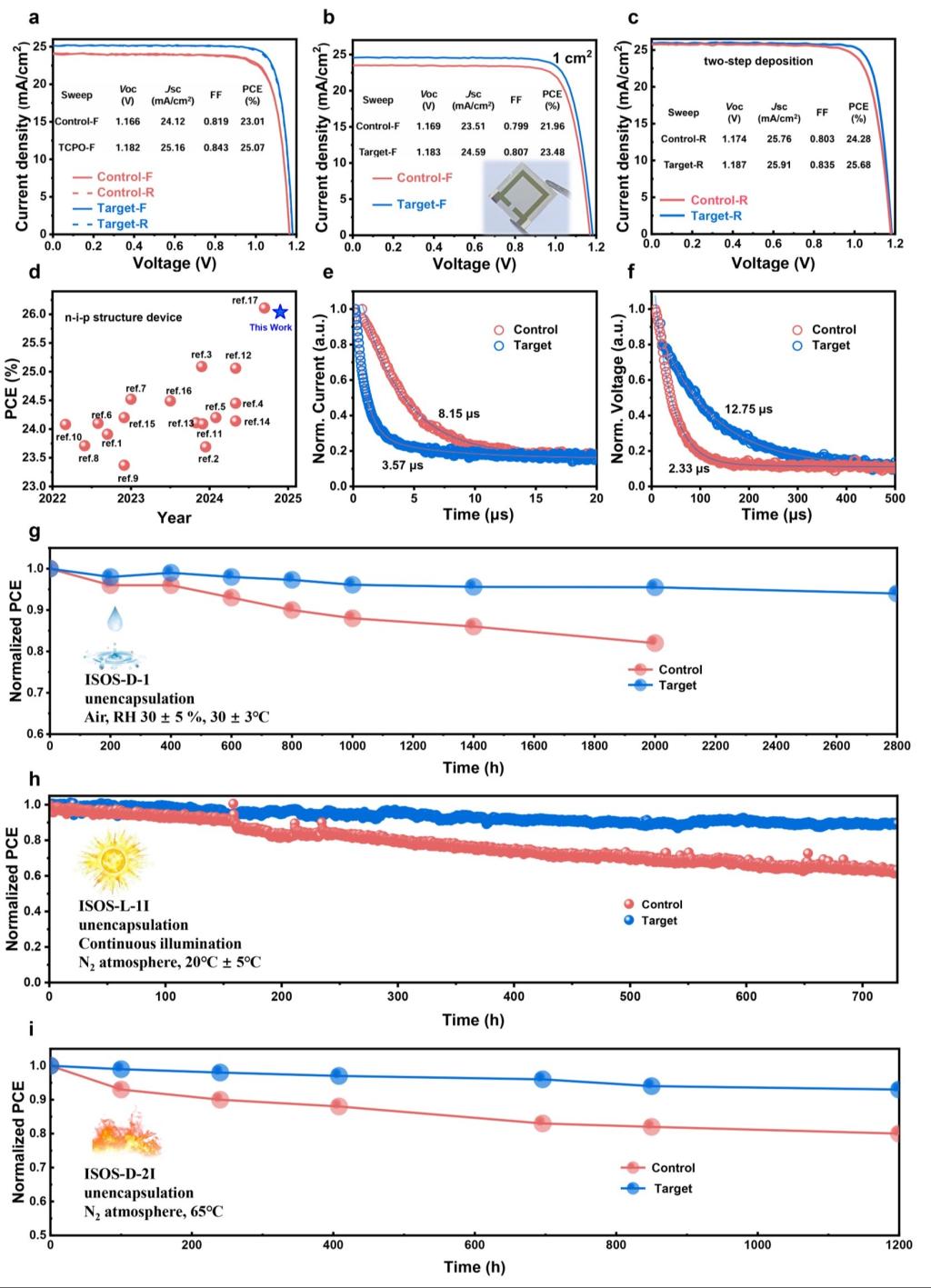 Li+、I-和Ag的迁移和扩散阻碍了长期运行稳定的钙钛矿太阳能电池(PSCs)的实现。鉴于此,陈江照教授团队提出了一种多功能主客体络合策略,将路易斯碱配体双(2,4,6-三氯苯基)草酸酯(TCPO)掺入Spiro-OMeTAD HTL,通过主客体络合相互作用,TCPO可以同时抑制Li+、I-和Ag的迁移和扩散,从而稳定钙钛矿层、HTL和银电极及其界面。此外,TCPO促进了Spiro-OMeTAD的掺杂过程,加速了空穴提取和转移。TCPO掺杂后,钙钛矿薄膜表面缺陷减少,陷阱辅助的非辐射复合降低。引入两个疏水三氯苯基增强了HTL的防潮性,并保护了底层钙钛矿薄膜免受环境空气中水分的侵袭。掺杂TCPO的正式器件实现了25.68%的冠军PCE(认证效率为 25.59%)。未封装的TCPO掺杂器件在最大功率点(MPP)连续运行730小时后衰减仅9.98%,在30%相对湿度(RH)的环境空气中老化2800小时后仍能保持初始效率的94.1%,这是迄今为止正式PSC报道的最高稳定性之一。该研究显著提高了正式器件的稳定性,为后续相关研究和商业应用奠定了坚实的基础。该工作通过合理设计多功能Lewis碱配体分子,为通过主客体络合策略提高PSC的光伏性能和长期稳定性提供了有价值的参考和指导。