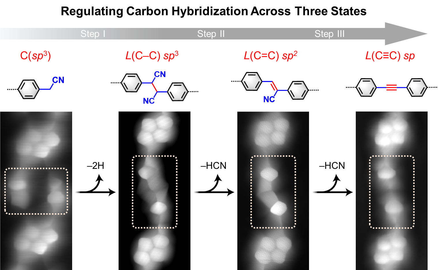 鉴于此,三亿体育_三亿(中国)一站式服务官方网站材料科学与工程学院蔡金明教授和卢建臣教授团队,借助具有单原子分辨能力的扫描隧道显微镜(STM)和具有化学键分辨能力的非接触原子力显微镜(NC-AFM)等表面分析技术,系统地研究了多种乙腈功能化分子在Au(111)、Ag(111)、Ag(110)表面的化学反应,精确识别了亚甲基中sp3杂化的碳原子逐步转变为sp2和sp杂化态。并结合第一性原理计算揭示了氰基基团的吸电子效应以及热退火解离导致的消去反应对特定碳原子饱和度的影响机制。该工作精准调控了碳原子三种杂化态的连续转变,有助于构筑更多新型碳基低维纳米材料。