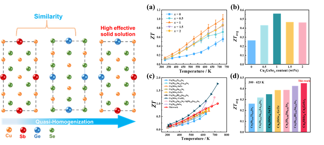 4.提出了准同质掺杂策略,实现了高效固溶,并获得热电性能显著提升的铜锑硫基热电材料,以《Highly Effective Solid Solution towards High Thermoelectric and Mechanical Properties in Cu3SbSe4−Cu2GeSe3 Bulk Materials via Quasi-Homogenization Doping》为题,发表在无机化学一区期刊Inorganic Chemistry上,材料科学与工程学院硕士研究生殷浩为第一作者,葛振华教授、冯晶教授为通讯作者;