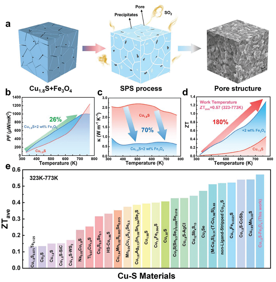 固相反应是材料制备、加工和应用环节中的基本反应,在材料科学和化学研究中无处不在。在冶金学和地质学领域,大量复杂化学反应发生在矿石的冶炼过程中。受铜精矿冶炼的启发,本工作设计改进的固态反应并将其应用在热电材料领域。通过控制反应温度和组成,可以制备多孔硫化铜磁性纳米复合材料。通过成分调节产生大量析出相和富铜相,并通过控制微观结构形成多孔结构。得益于第二相和多孔结构的构筑,导热系数得到了有效的降低。此外,铁磁性Fe3O4粒子的引入不仅降低了载流子浓度,还形成了散射低能载流子的势垒,提高了样品的塞贝克系数。最终,Cu1.8S + 2 wt.% Fe3O4样品在773 K时的最佳ZT为≈1.3,在整个工作温度范围内的平均ZT为0.57。