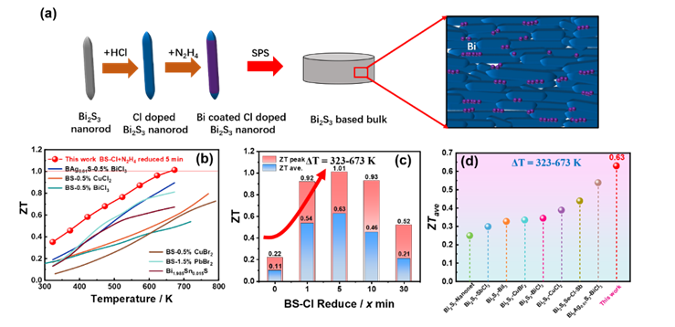 热电材料是能够直接将热能转换为电能的材料,具有广泛的应用前景,尤其是在能源回收和温差发电领域。近年来,随着能源危机和环境问题的日益严重,热电材料作为一种绿色、可持续的能源转换技术受到了广泛关注。硫化铋(Bi₂S₃)由于其良好的热电特性,成为热电材料研究的热点之一。该项研究成果提出了一种创新的自下而上的结构设计策略,有效优化了硫化铋材料的热电性能。硫化铋作为一种具有巨大潜力的热电材料,长期以来面临如何在电导率较低的情况下提升热电性能的挑战。通过精确调控材料的微观结构,研究团队成功地提升了硫化铋的热电优值(ZT),并在673K时首次达到了超过1的ZT值,展示了该材料在商业化应用中的巨大潜力。未来,团队将继续探索更多热电材料的优化方案,并通过跨学科合作和技术创新,推动热电材料在可持续能源、电子设备以及汽车工业等领域的应用。研究人员期待这一自下而上的结构设计理念能够在其他热电材料系统中推广,进一步提升其商业化前景。