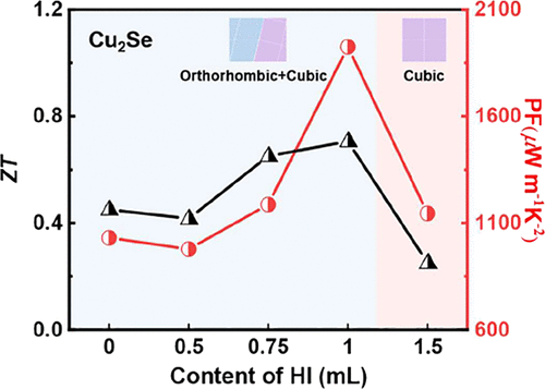 声子液体-电子晶体(PLEC)特性是实现Cu2Se基材料优异电、热输运性能的关键。然而,高温立方Cu2Se在室温下很难获得,这抑制了其在宽温度范围内的热电性能。本研究提出了一种在水热反应过程中使用氢碘酸作为掺杂剂来改变硒化铜的相结构和热电性能的策略。碘掺杂可以有效地控制硒化铜的相变,使硒化铜在室温下存在立方相。由于相结构和载流子浓度的变化,碘离子掺杂Cu2Se的电导率显著增加。因此,在773 K时,Cu2Se-1 ml HI样品的功率因子高达1925 μW m-1 K -2。最终,碘离子掺杂Cu2Se的平均热电性能在整个温度范围内得到了改善。本研究为可控调控硒化铜的相结构和热电性能提供了新的途径,值得在其他体系中推广。