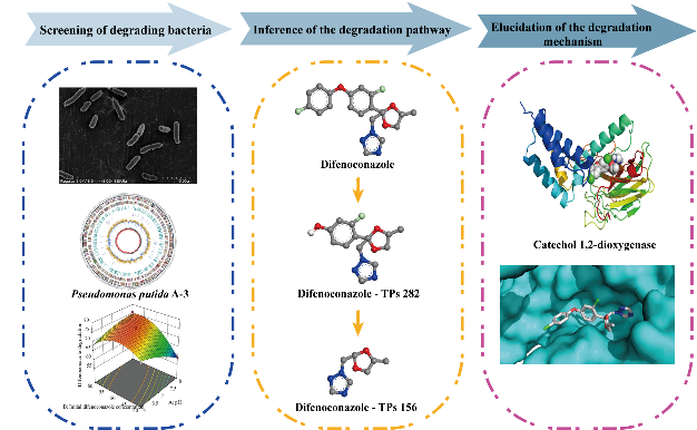 基于基因组和转录组学测序分析,预测到6个潜在的苯醚甲环唑降解基因。结合同源建模和分子对接技术,表明6个潜在降解酶与DIF之间的相互作用模式主要是蛋白与DIF之间形成氢键相互作用和烷基相互作用。最后,将P. putida A-3接种到DIF污染的水-沉积物污染体系中显著缩短了DIF半衰期,并增加了具有DIF降解能力的微生物丰度,从而促进了DIF从环境中的去除。本研究揭示了新型的苯醚甲环唑微生物降解途径,并丰富了生物降解苯醚甲环唑的微生物资源,为苯醚甲环唑残留污染的生物修复提供了强有力的候选者。同时,本研究也为提升三七质量安全以及云南道地药材外源污染物的防控提供新的思路。