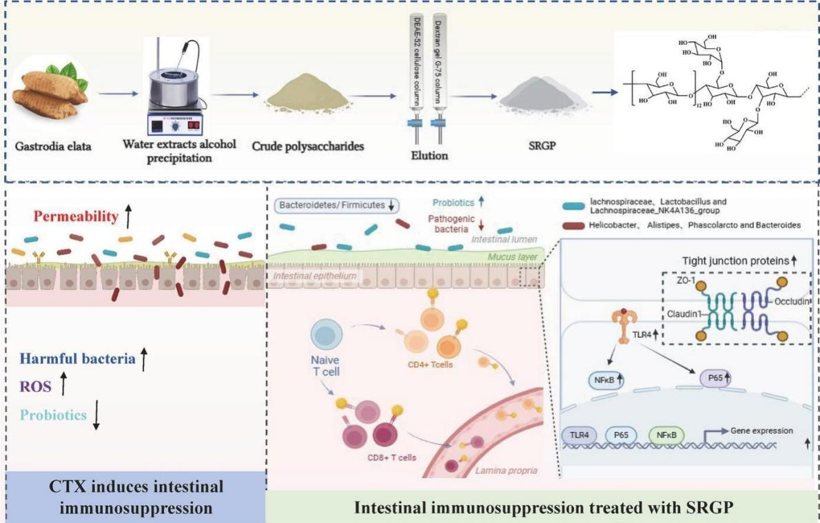 在国家重点研发计划(2023YFC3503802)和云南省“双一流”专项(202202AG050008)支持下,云南省三七资源可持续利用重点实验室和云南省高校靶点药物筛选与利用重点实验室对该问题展开了联合研究。团队发现硫磺熏蒸可以改变淀粉颗粒中淀粉链的释放度,提高其糊化特性以及硬度、咀嚼性和粘性等烹饪品质,但会降低天麻的药用成分含量、食用品质和风味;可通过改变天麻多糖的结构,降低其抗氧化活性与细胞氧化应激保护作用。同时项目组也在硫磺熏蒸天麻中成功分离、提取和纯化了一种新型的天麻多糖,其能够促进肠道免疫缺陷小鼠肠道免疫细胞增殖、调节细胞因子分泌、增强肠道屏障,同时有助于恢复失衡的肠道微生物菌群,比商用葡聚糖表现出更优越的肠道免疫调节活性。