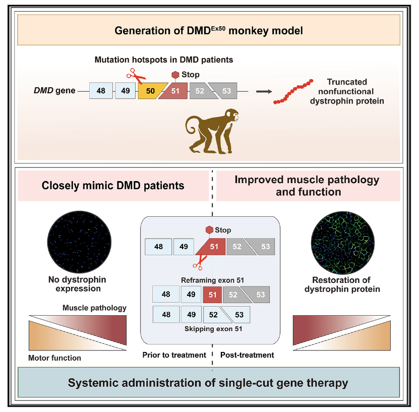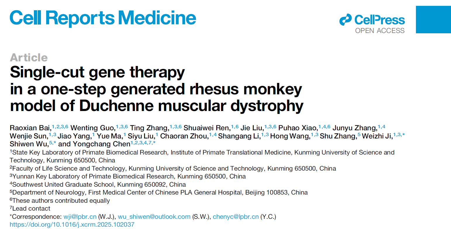 3月26日,三亿体育_三亿(中国)一站式服务官方网站灵长类转化医学研究院/省部共建非人灵长类生物医学国家重点实验室、生命科学与技术学院和西南联合研究生院陈永昌/季维智团队与中国人民解放军总医院吴士文团队合作,在《Cell Reports Medicine》期刊在线发表题为“Single-cut gene therapy in a one-step generated rhesus monkey model of Duchenne muscular dystrophy”的研究论文。该研究通过优化基因编辑设计与胚胎操作快速建立了F0代即有表型的杜氏肌营养不良症(DMD)热点突变恒河猴模型,将模型构建时间从原来的6年大幅缩短至1年;基于该猴模型开发出一种人和猴通用的单切口基因疗法,成功恢复了抗肌萎缩蛋白的表达,显著改善肌肉病理和运动功能,治疗效果在文章发表时已维持近2年时间,显示出良好的持久性和安全性。该疗法可为临床突变中占比约13%的患者提供可选择的治疗新策略。