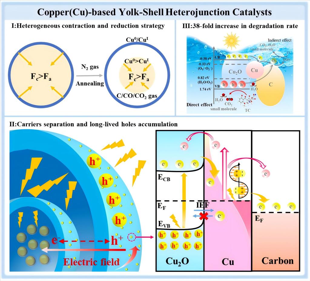 针对这一科学难题,研究团队开创性地将多尺度结构工程与异质界面工程相结合,提出“结构-电场”协同调控策略,成功设计了具有蛋黄-双壳构型的铜基复合微球。该材料通过构建多级电子传输通道与梯度电场,迫使光生电子向内核定向迁移,同时将氧化性空穴锚定在表面活性位点。结合铜纳米颗粒的等离子体共振增强效应,实现了光能吸收与电荷分离效率的同步提升,使四环素类抗生素的太阳能驱动降解效率达到传统材料的数十倍,且处理后的水体满足生态安全要求。这项突破为在半导体光催化剂上积累长寿命空穴提供了一种全新的设计策略,助力新型水处理技术的发展。