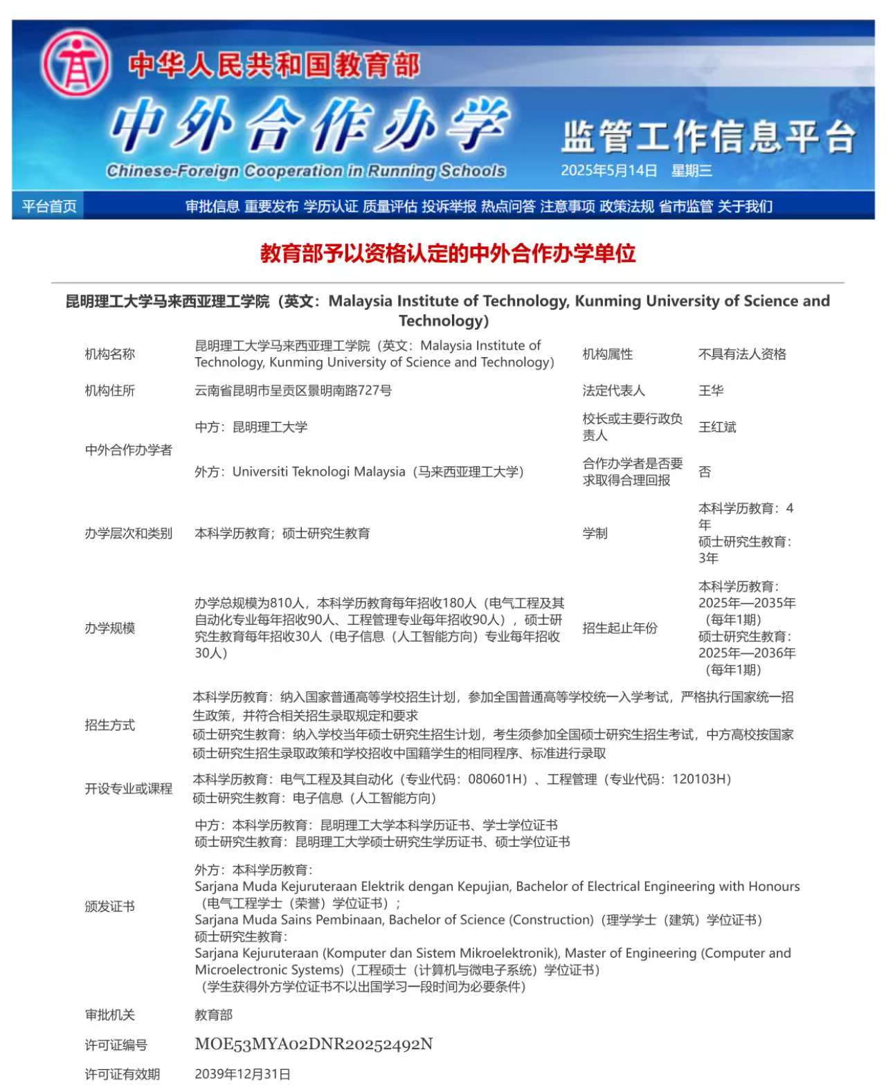 三亿体育_三亿(中国)一站式服务官方网站马来西亚理工学院将实现当年批复、当年招生。首年将招收电气工程及其自动化、工程管理两个本科专业学生,纳入国家普通高等三亿体育_三亿(中国)一站式服务官方网站招生计划,采用“4+0”双证模式培养。2026年将招收电子信息(人工智能方向)一个硕士专业学生,采用“3+0”双证模式培养。符合三亿体育_三亿(中国)一站式服务官方网站和马来西亚理工大学入学要求的学生可同时注册两校学籍,达到两校毕业条件的学生可同时获得我校学历和学位证书以及马来西亚理工大学的学位证书。马来西亚理工大学在2025年QS世界大学排名第181位,是马来西亚最著名的五所公立研究型大学之一,被认为是马来西亚在工程、科学和技术领域的首要学府。