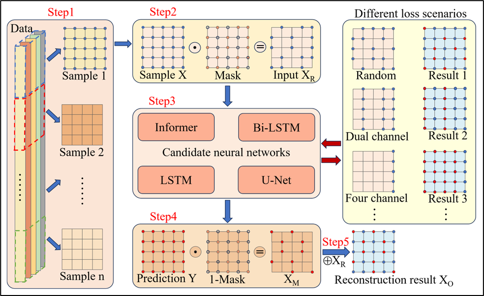 针对这一难题,研究团队将数据重构建模为矩阵填充问题,提出一种基于时间序列专用神经网络的桥梁监测数据重构方法。通过构造掩码矩阵模拟数据包随机丢失和传感器通道完全丢失等复杂场景,构建并对比多种深度神经网络深入挖掘缺失数据前后的时空关联,实现高精度重构。特别对Informer网络进行了结构优化,以提升其对数据重构任务的适应性。结果显示,所提出方法有效提升了复杂环境下的SHM数据完整性,为后续的数据分析与挖掘奠定基础。