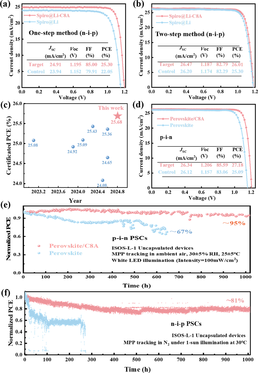 多种化学物种的迁移是导致钙钛矿太阳能电池本征不稳定的主要原因。鉴于此,三亿体育_三亿(中国)一站式服务官方网站陈江照、何冬梅等人报道了一种通用的离子迁移抑制策略来稳定多个功能层,通过杯芳烃超分子的主客体作用同时抑制多种化学物种的迁移。引入4-叔丁基杯[8]芳烃(C8A)后,有效钝化了界面缺陷,抑制了陷阱态辅助的非辐射复合。同时,促进了Spiro-OMeTAD的P型掺杂,加速了正式n-i-p钙钛矿电池的空穴提取与输运。基于两步法制备的C8A掺杂的正式电池实现了26.01%(认证效率为25.68%)的效率,这是基于TiO2的平面正式电池报道的世界纪录效率。C8A钝化的p-i-n反式电池获得了27.18%(认证效率为26.79%)的效率,这是真空闪蒸技术制备的钙钛矿电池报道的最高效率。C8A修饰的反式电池在最大功率点持续跟踪1015小时后仍然保持初始效率的95%。本工作提供了一种行之有效的方法来解决钙钛矿光伏器件和其他钙钛矿基光电器件的本征不稳定性问题。