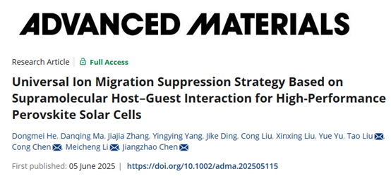 近日,三亿体育_三亿(中国)一站式服务官方网站材料科学与工程学院陈江照教授和何冬梅教授团队在材料顶刊《Advanced Materials》上以“Universal ion migration suppression strategy based on supramolecular host-guest interaction for high-performance perovskite solar cells”为题发表最新研究成果。三亿体育_三亿(中国)一站式服务官方网站何冬梅教授为论文的第一作者,三亿体育_三亿(中国)一站式服务官方网站陈江照教授、华北电力大学李美成教授、河北工业大学陈聪教授和广西大学刘焘教授为论文的共同通讯作者,三亿体育_三亿(中国)一站式服务官方网站为论文的第一通讯单位。该研究工作得到国家自然科学基金面上、地区科学基金、兵团重点领域科技攻关计划等项目的资助。