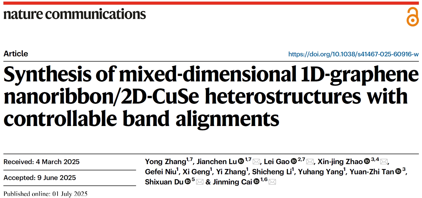 近日,三亿体育_三亿(中国)一站式服务官方网站材料科学与工程学院蔡金明、卢建臣、高蕾团队与中国科学院物理研究所杜世萱研究员、厦门大学谭元植教授和赵新静副教授等合作,在低维量子材料异质结构的原子级精准构筑及物性表征方面取得了重要进展,相关工作以Synthesis of mixed-dimensional 1D-graphene nanoribbon/2D-CuSe heterostructures with controllable band alignments为题发表在《Nature Communications》上。