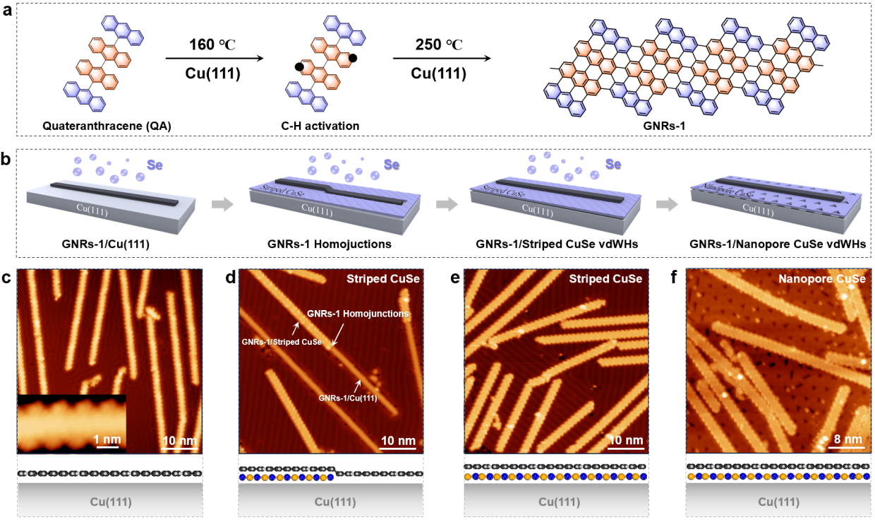 一维/二维异质结构由于其高效的光电和催化性能而引发人们的研究兴趣。实现一维/二维异质结构大规模应用的关键在于精确调控其能带排列,这在实验上具有挑战性。为此,团队提出了一种分级生长策略:首先,在Cu(111)表面上合成石墨烯纳米带(GNRs)。然后,在预制备的GNRs样品上沉积硒原子,经过热退火处理,硒原子与衬底中的铜原子发生反应,形成硒化铜(CuSe)单层。通过控制硒原子的沉积量,原子级精确地得到GNRs同质结及1D-GNR和2D-CuSe异质结构。通过扫描隧道显微镜、非接触式原子力显微镜表征以及密度泛函理论计算,对整个生长过程进行实空间观测。利用扫描隧道显微谱测量了GNRs同质结及1D-GNR和2D-CuSe异质结构的电学性质。测量结果表明:GNRs-1同质结在带排列上表现出p-n结特征,而1D-GNR和2D-CuSe异质结则具有可调的能带排列(Ⅰ型和Ⅱ型)。这项工作为精确合成具有不同带排列的1D/2D异质结构提供了一种有前途的方法,有助于高性能纳米器件的开发。