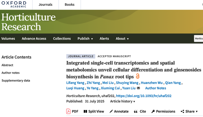 2025年8月,《Horticulture Research》(中国科学院一区Top)在线发表了崔秀明研究员团队完成的题为“Integrated single-cell transcriptomics and spatial metabolomics unveil cellular differentiation and ginsenosides biosynthesis in Panax root tips” 的研究论文。该研究首次对人参属三个物种(三七、人参、西洋参)的根尖进行了单细胞转录组测序和空间代谢组学的联合分析。