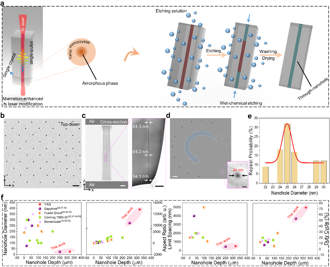 研究人员巧妙地利用球差增强效应和非线性限域效应,开发了一种湿化学辅助的单脉冲飞秒激光纳米光刻技术(wet-chemical etching assisted aberration-enhanced single-pulsed femtosecond laser nanolithography: WEALTH),实现了25 nm超小孔径、104:1超高深径比、10 mm2甚至cm2级超大面积的孔洞纳米结构制造,性能和指标远超传统光刻技术。WEALTH的发明对于实现大面积、消色差、宽带可调的超透镜、纳米光子结构器件、纳米生物传感检测器件等具有重要意义。