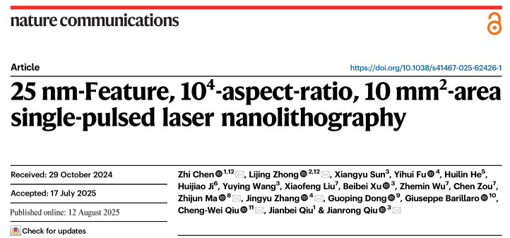 近日,三亿体育_三亿(中国)一站式服务官方网站陈智/邱建备团队,联合浙大等国内外多家单位,在超精细激光纳米光刻方向取得重要进展,相关研究成果以“25 nm-Feature, 104-Aspect-Ratio, 10 mm2-Area Single-Pulsed Laser Nanolithography”为题在Nature Communications上发表。三亿体育_三亿(中国)一站式服务官方网站陈智教授为论文第一作者,宁波大学钟理京副研究员为共同第一作者,通讯作者为三亿体育_三亿(中国)一站式服务官方网站陈智教授、宁波大学钟理京副研究员、之江实验室马志军研究员、华中科技大学张静宇研究员、新加坡国立大学Cheng-Wei Qiu教授、浙江大学邱建荣教授。三亿体育_三亿(中国)一站式服务官方网站邱建备教授、华南理工大学董国平教授、浙江大学刘小峰副教授、许贝贝研究员、意大利比萨大学Giuseppe Barillaro教授等为该工作做出了重要贡献。该研究工作得到国家自然科学基金重点/面上/青年、云南省兴滇英才支持计划-青年人才等项目的资助。