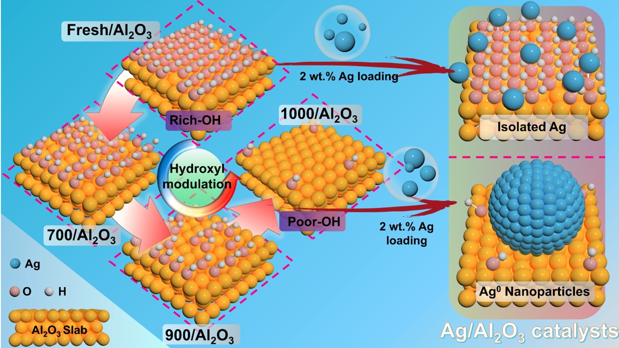 调控催化剂活性中心的尺寸对其活性和选择性有着深远的影响。本研究展示了一种精确控制Al2O3表面Ag物种尺寸的策略,从而能够定制2% Ag/Al2O3催化剂以适应各种催化反应。基于羟基作为Ag锚定位点的机理,合成了富含羟基的Al2O3载体,并随后通过焙烧逐步降低了羟基含量。这种方法使得Ag物种能够以单原子、团簇或纳米颗粒的形式存在于Al2O3表面。随着Ag尺寸从单原子增加到团簇再到纳米颗粒,催化剂的O2活化能力逐渐增强,导致O2参与反应的性能显著变化。值得注意的是,这种富含羟基的载体的合成简便且可重复。相关研究结果为合理设计具有可控活性中心尺寸的负载型Ag基催化剂,并用于各种催化反应提供了理论指导。此外,羟基介导的原子尺度的催化剂设计还可适用于Cu、Pd、Ni等其他活性金属。