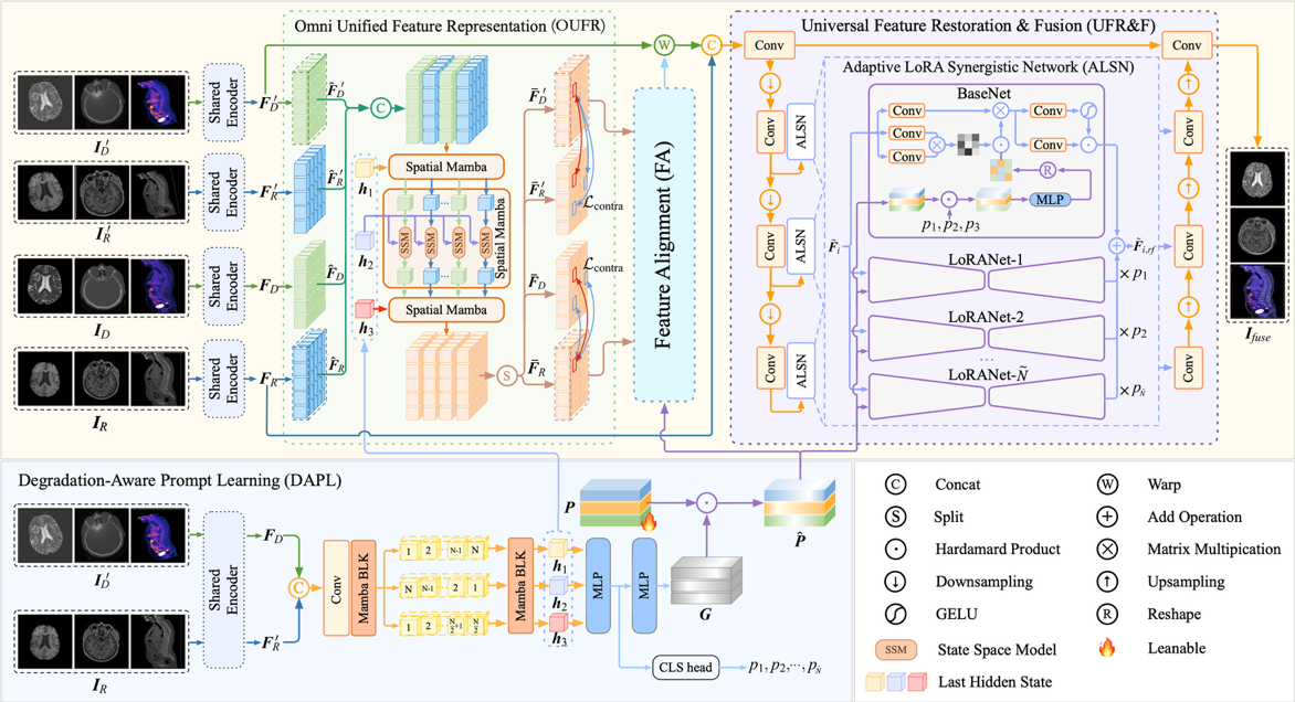论文简介:当前的多模态医学图像融合方法通常假设源图像具有高质量并在像素级上完全对齐,其性能在很大程度上依赖于这一前提条件,在处理失配或退化图像时效果显著下降。为了解决这一问题,提出了一个通用融合框架——UniFuse。该框架引入了一个感知退化的提示学习模块,能够从输入图像中无缝整合多方向信息,并将跨模态对齐与图像修复任务关联起来,实现两者在统一架构下的联合优化。此外,设计了全向统一特征表示机制,利用Spatial Mamba对多方向特征进行编码,有效缓解模态差异带来的对齐误差。为了实现图像修复与融合的一体化处理,提出了通用特征修复与融合模块,并引入基于LoRA原理构建的自适应LoRA协同网络,利用其自适应特征表示能力和退化类型感知机制,在单阶段框架中实现了图像修复与融合的联合优化。与传统的分阶段方法相比,UniFuse在对齐、修复和融合方面实现了真正的一体化。多个数据集上的实验结果表明,该方法在性能上显著优于现有方案。