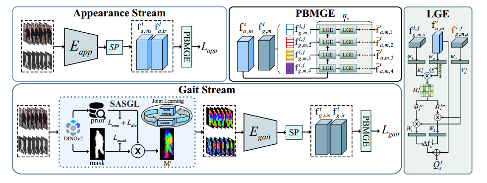 论文简介:基于视频的可见光-红外人员重新识别(VVI-ReID)旨在从视频序列中跨可见光和红外模态检索同一行人。现有方法倾向于利用模态不变的视觉特征,但在很大程度上忽略了步态特征,这些特征不仅是模态不变的,而且具有丰富的时间动态,从而限制了它们对跨模态视频匹配至关重要的时空一致性进行建模的能力。为了应对这些挑战,提出了一个 DINOv2 驱动的步态表示学习(DinoGRL)框架,该框架利用 DINOv2 丰富的视觉先验来学习与外观线索互补的步态特征,从而促进跨模态检索的稳健序列级表示。具体来说,引入了一种语义感知轮廓和步态学习(SASGL)模型,该模型使用 DINOv2 中的通用语义先验生成和增强轮廓表示,并与 ReID 目标共同优化它们,以实现语义丰富和任务自适应步态特征学习。此外,开发了一个渐进式双向多粒度增强 (PBMGE) 模块,该模块通过跨多个空间粒度实现步态和外观流之间的双向交互来逐步细化特征表示,充分利用它们的互补性来增强具有丰富局部细节的全局表示并产生高度区分的特征。在 HITSZ-VCM 和 BUPT 数据集上的大量实验证明了所提出方法的优越性,其明显优于现有的最先进方法。